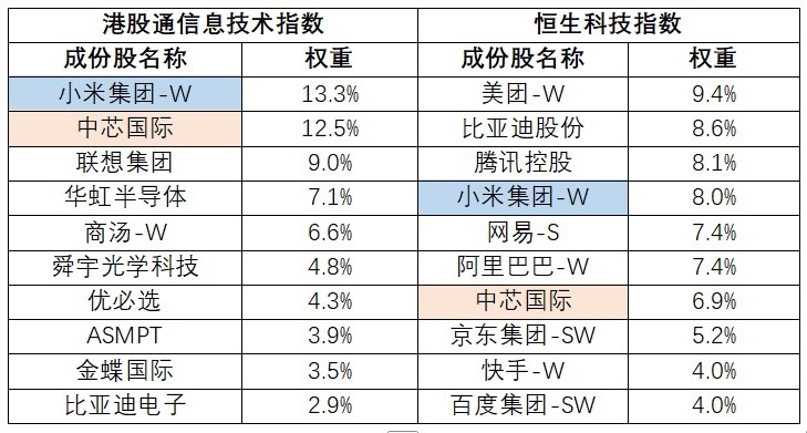 表:中证港股通信息技术指数与恒生科技指数前十大成份股对比
