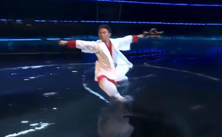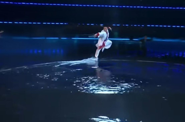 随着现场的音乐声响起,谢苗吊着钢丝“从天而降”,一身纯白色的练功服,平添了一股“大师风范”。