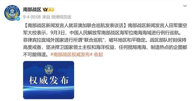 澳加与南海并无地理关系,却远道而来进行军事展示,既有菲律宾的相邀,又有共同的“大哥”——华盛顿的指示,也有扩大各自在亚太影响力的政治诉求,也因此在南海问题上,与菲律宾可谓一拍即合。 在九三阅兵结束后的九月四日,南部战区新闻发言人就菲澳加联合巡航发表谈话,菲律宾拉拢域外国家进行所谓“联合巡航”,破坏地区和平稳定。