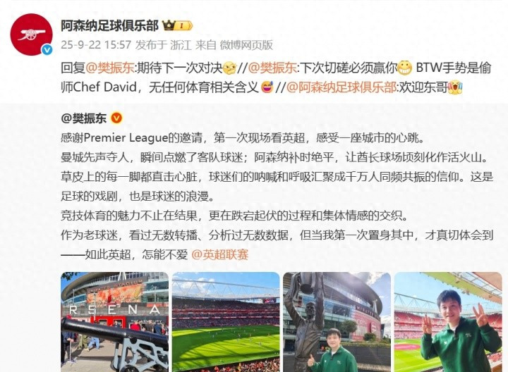 阿森纳官方微博也评论了樊振东,表示:欢迎东哥。
