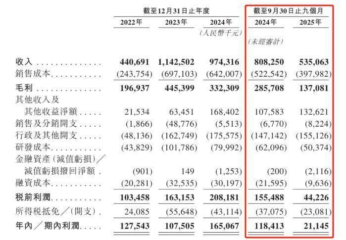 业绩方面,2022年至2024年,公司营收分别为4.41亿元、11.43亿元、9.74亿元;毛利分别为1.97亿元、4.45亿元、3.32亿元;期内利润分别为1.28亿元、1.08亿元、1.65亿元。